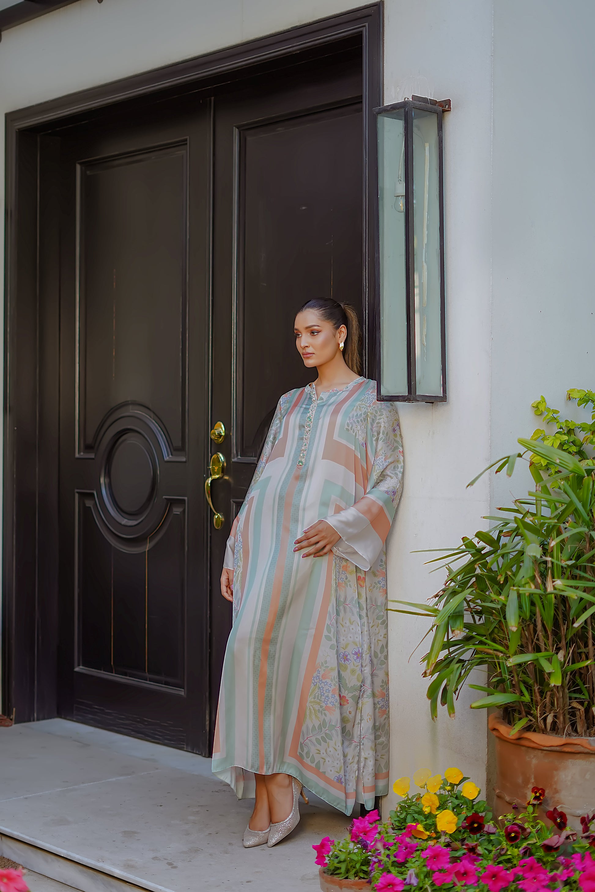 Discover timeless elegance with our Charmeuse Silk Printed Kaftan, designed to elevate your style. Crafted from luxurious charmeuse silk, this kaftan features a vibrant, eye-catching print that flows beautifully with every movement. The jewel-embellished neck placket adds a touch of opulence, transforming this piece into a statement of sophistication. Soft, smooth, and breathable, the charmeuse fabric ensures all-day comfort while offering a refined look. Perfect for both casual outings and evening affairs, this kaftan is the ultimate fusion of luxury and style.