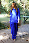 Make a bold statement with our Pure Raw Silk Shirt and Farshi Shalwar set in vibrant electric blue. Crafted from the finest raw silk, this ensemble offers a luxurious texture and a rich, lustrous finish that catches the light beautifully. The shirt features a flattering silhouette, while the Farshi shalwar offers an elegant, voluminous drape that adds a regal touch to the outfit. The striking electric blue color adds a modern twist to this timeless design, making it perfect for formal events, weddings, or special occasions. This outfit seamlessly combines traditional charm with contemporary style, ensuring you stand out in any crowd.