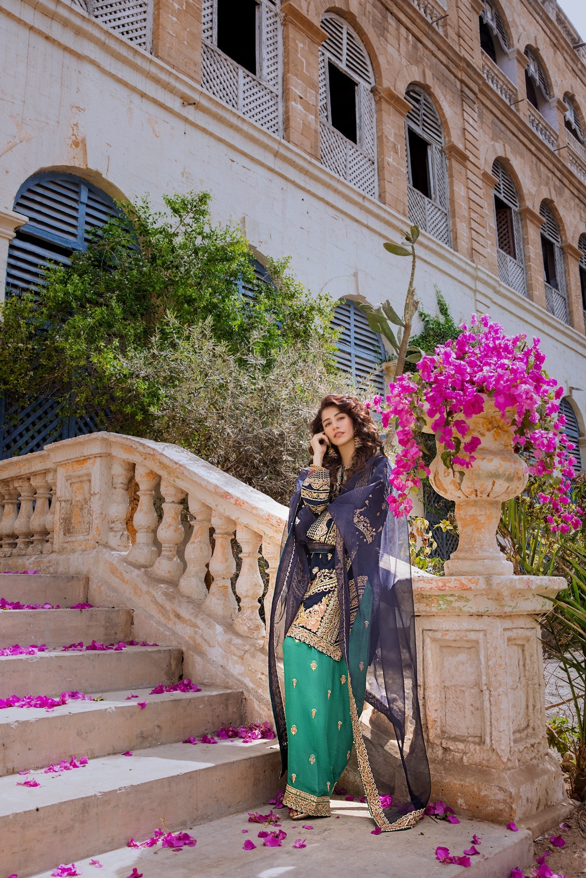 A traditional outfit with a twist of modernity featuring a short shirt, a sheer worked dupatta, and an embellished shalwar. The shirt is meticulously crafted with gold handwork on the bodice, and the shalwar is made of aqua-hued fabric with glistening hem work. A sheet navy dupatta completes the outfit.