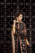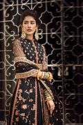 A black canvas tailored into a front slit open gown with elaborate floral embroidery all over and handworked borders and sleeves. It is paired with a flowy sharara and a sheer dupatta dusted with delicate coral motifs.