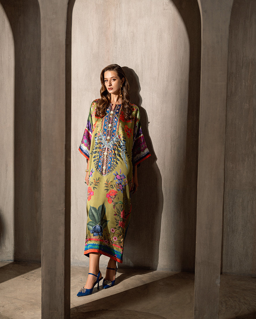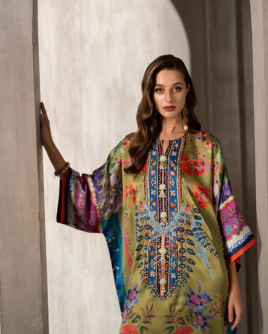 Elevate your wardrobe with our exquisite Sharmose Silk Kaftans, designed for effortless grace and timeless charm. Each piece showcases striking prints and features a luxuriously hand-embellished neckline, making it the perfect fusion of elegance and comfort.