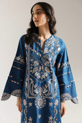 This stunning two-piece ensemble is crafted from a beautiful blue fabric that serves as a rich backdrop for its intricate designs. The long, flowing shirt features elaborate embroidery in a palette of light pink, white, and subtle metallic threadwork. The detailed floral and paisley motifs on the neckline, front, and sleeves create a truly opulent look. The suit is completed with matching trouser, making it a perfect choice for any special occasion.