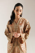 Adorn yourself in the delicate artistry of this stunning embroidered suit. This elegant two-piece ensemble features a rich brown base, serving as a beautiful canvas for the intricate floral embroidery. The long shirt is decorated with stylized flowers and foliage in shades of orange, white, and green, with subtle metallic threadwork that adds a gentle shimmer. The hem of the shirt is scalloped that give the piece a playful touch. The suit is completed with white shalwar that feature matching floral embroidery along the cuffs. This outfit is perfect for special occasions, offering a beautiful blend of traditional charm and modern style