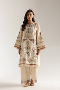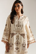 A vision of understated elegance, this suit is a creamy canvas brought to life with striking embroidery in a rich, earthy bronze. The shirt is adorned with a spread of intricate patterns that flow across the front and wide, graceful sleeves, each finished with a beautiful scalloped border. The ensemble is perfectly completed by the matching wide-leg shalwar, which mirrors the shirt's detailed hemline. This timeless set is a testament to heritage craftsmanship, offering a look that is both classic and uniquely captivating.