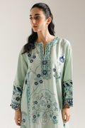 This stunning two-piece ensemble is crafted from a soft, light green fabric that serves as the perfect canvas for its intricate designs. The long shirt features elaborate floral and geometric embroidery in various shades of blue. The detailed motifs on the neckline, sleeves, and hem create a truly mesmerizing look. The suit is completed with matching trouser, making it a perfect choice for any occasion.