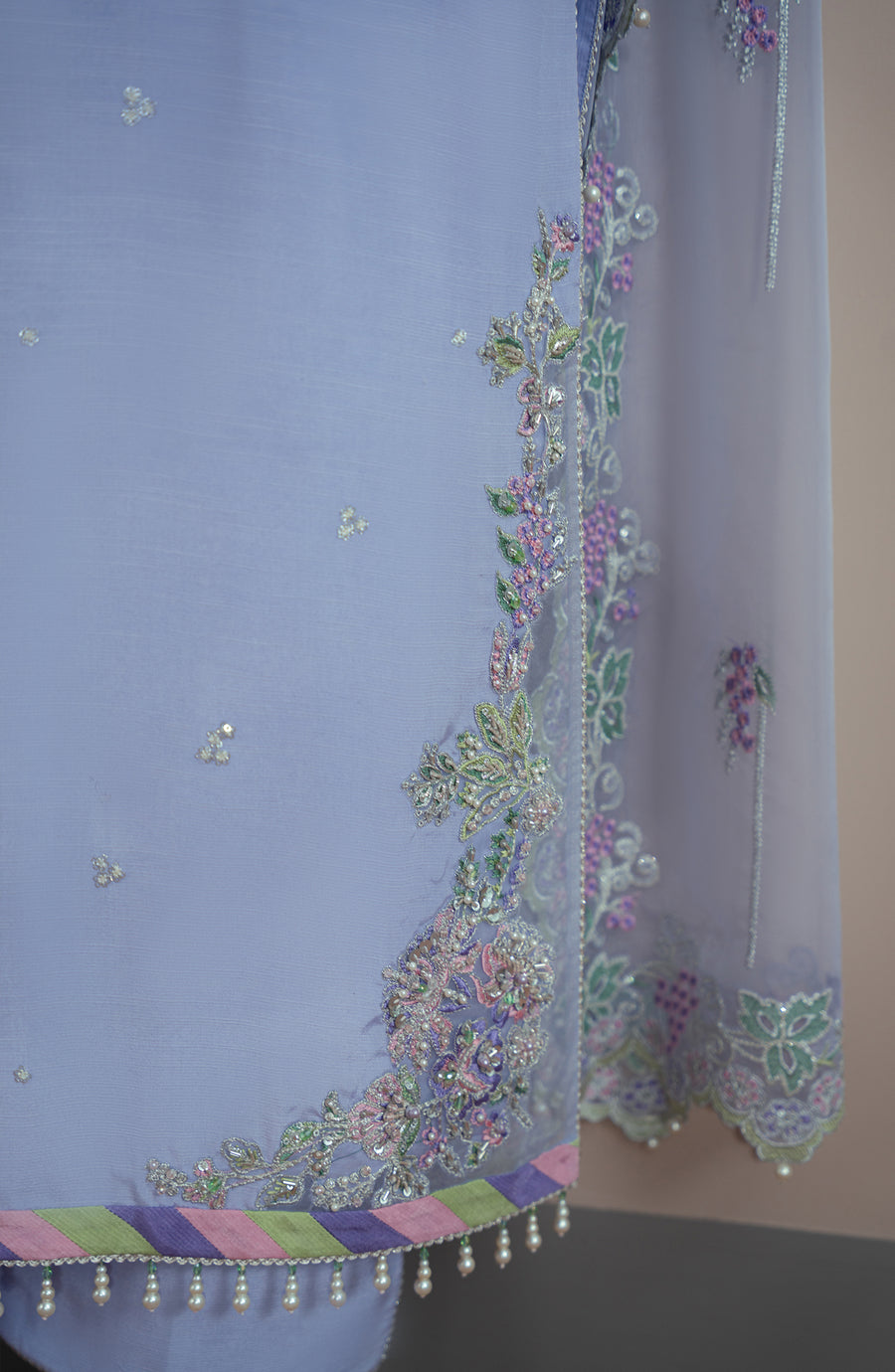 An epitome of serene sophistication, the IRIS from the by Fabiha Fatima is crafted in misty blue raw silk that radiates timeless charm through its graceful silhouette and lustrous finish. Paired with matching raw silk trousers for added depth and elegance, the look is elevated by a sheer organza dupatta that drapes delicately, infusing the ensemble with ethereal finesse. Designed for festive soirées and refined celebrations, the IRIS Shirt reflects understated luxury with modern elegance.