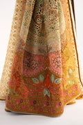 This ivory full-length jacket is pure elegance, featuring a jaal pattern that adds a refined texture. With a V- neckline and wide borders on the sleeves, it brings a stylish edge to a classic look. The organza lining offers a light, flowing feel, while the jacket is paired with luxurious jamawar pants for a rich contrast. A heavy-work shawl with intricate cutwork completes the ensemble, making it ideal for an effortlessly sophisticated, high-fashion statement.