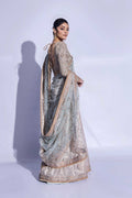 Pastel Embroidered blouse with zardozi, crystal, and sequence work on neckline and sleeves motif paired with embroidered net drape and tissue fall saree with embroidered border and zardozi work on it and pk silk peti coat.