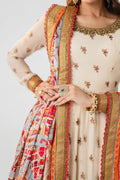 Ivory long-sleeved dress that has delicate embroidery on the bodice and sleeves. The dress has a flowing skirt with a landscape patterned hem on net with underbody in lawn in tier style. A vibrant printed dupatta in silk finished with embroidered and banarsi boarders, paired with sharara pants and finished with banarsi boarder