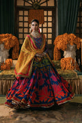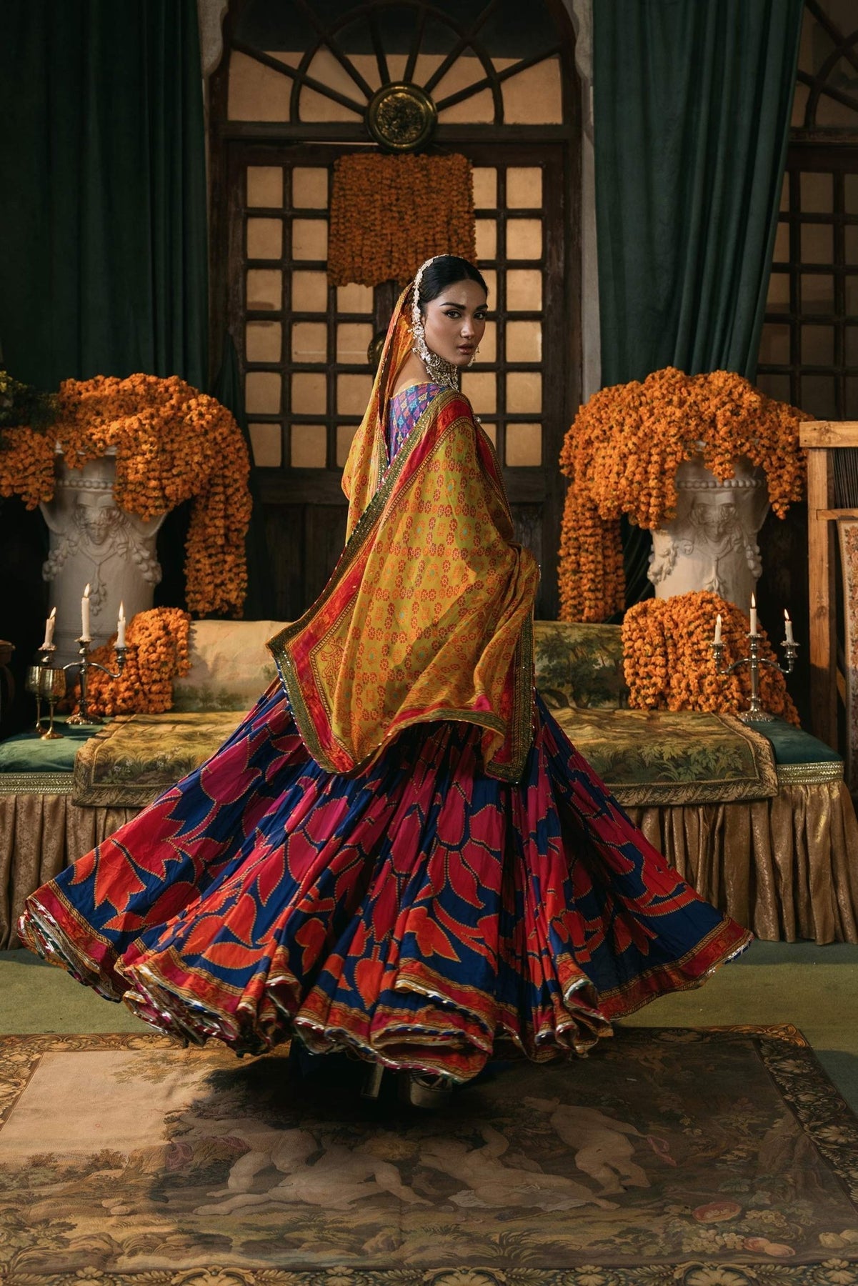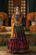 Our exquisite lawn pishwas boasts a rich blue chunri print, elegantly highlighted by detailed zardozi neckline embellishments that radiate luxury. The piece features a flowing 42-yard flare, perfectly paired with a sumptuous satin silk dupatta and solid pants, creating a harmonious blend of refinement and grace.