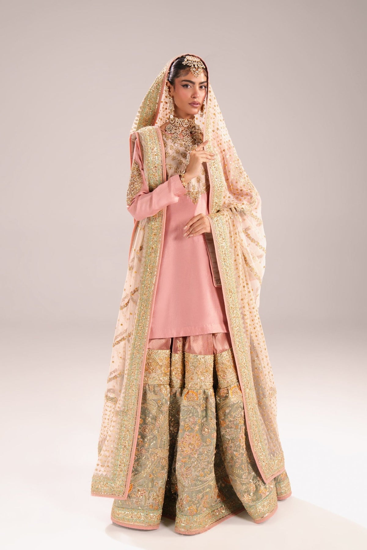This beautiful, heavily embellished three piece gharara suit notable for its soft pastel color palette of blush pink and sage green.The raw silk top is a straight, long sleeved kurta in blush pink. The bodice features ivory yoke densely embroidered in contrasting gold/ivory zardozi. The tissue gharara is the focal point, featuring two distinct sections an upper layer in blush pink and a lower, voluminous tier in sage green, richly decorated with gold embroidery and small floral motifs. The look is completed with a net dupatta finished with ornate borders in jade and gold. overall effect is one of delicate, traditional elegance, perfectly suited for a contemporary pastel-themed wedding event Separates.