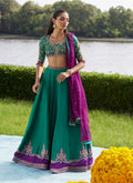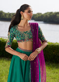 A vibrant ode to craftsmanship and color, this emerald and purple ensemble brings together traditional artistry with modern finesse. The block-printed choli shimmers with intricate handwork — kora, dabka, nakshi, resham, and crystals — creating a tapestry of texture and light. Paired with a delicately hand-embellished deep purple net dupatta and a graceful raw silk lehenga finished with subtle embroidery and playful tassels, this look is equal parts striking and sophisticated — made to dazzle at any festive celebration.
