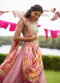 A pure medium silk dupatta, digitally printed in vibrant tones and trimmed with glimmering gota, ties the entire ensemble together with effortless elegance.