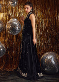 Effortlessly elegant and timelessly chic — this floor-skimming, sleeveless velvet jacket is extremely versatile. Elevated with pure silk threadwork borders and delicate pearl embellishments that shimmer subtly with each movement. Layer it over a flowing black raw silk frill dress, for a refined yet striking look, ideal for soirées and evening gatherings. Alternatively, you layer this statement making jacket over a sleek, black pure Charmeuse saree for a dramatic, scene stealing look.