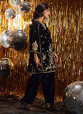 A classic black velvet shirt richly embroidered with subtly shimmering gold dabka work embellished with Swarovski crystals, offset with silk threadwork in pink and green. Complete your outfit with our velvet shalwar (as shown) to feel instantly dressed up. Styled with high heels, gold jewels and high pony tail you have an eternally stylish look!!