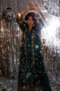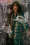 An ode to regal elegance, Forest Veil enchants with its deep emerald canvas and self-digital print that exudes quiet luxury. The long-length shirt is beautifully accentuated with intricate gold handwork, rendered with finesse along the neckline and panels to create a statement of timeless sophistication. Delicate craftsmanship meets modern refinement through subtle detailing and a graceful silhouette, perfectly paired with coordinated trousers and a matching digitally printed dupatta. A masterpiece of understated opulence, Forest Veil embodies refined artistry—designed for the woman who carries tradition with a modern spirit.