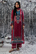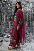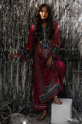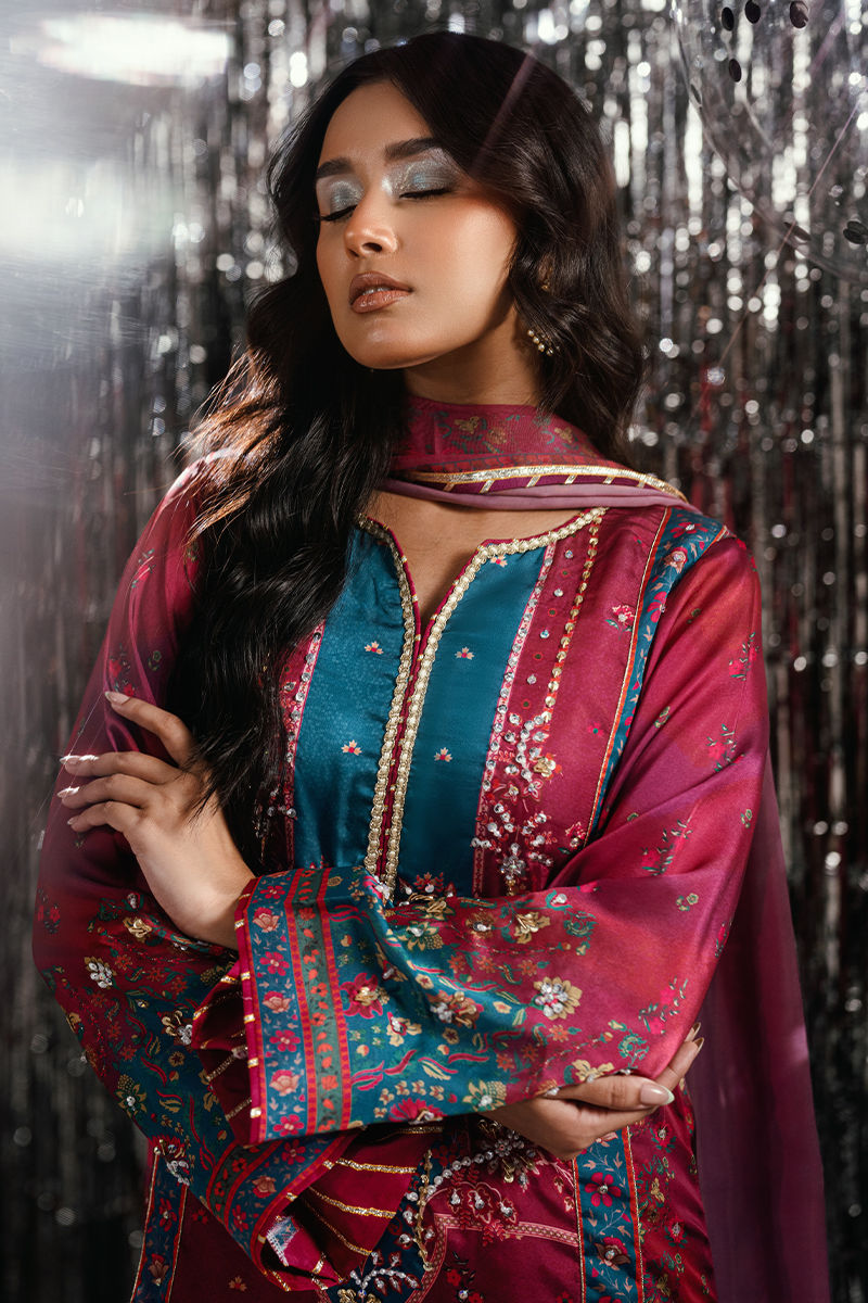 An elegant digital print ensemble featuring a long-length shirt in rich magenta tones, paired with a matching trouser. The design is enhanced with a self-digital pattern that exudes understated luxury. A beautifully composed digital print dupatta completes the look, adding depth and sophistication. Perfect for festive gatherings or refined daywear with a touch of modern tradition.