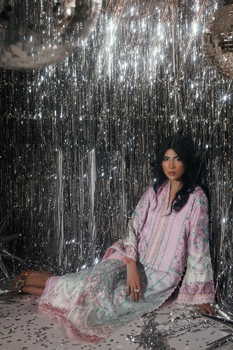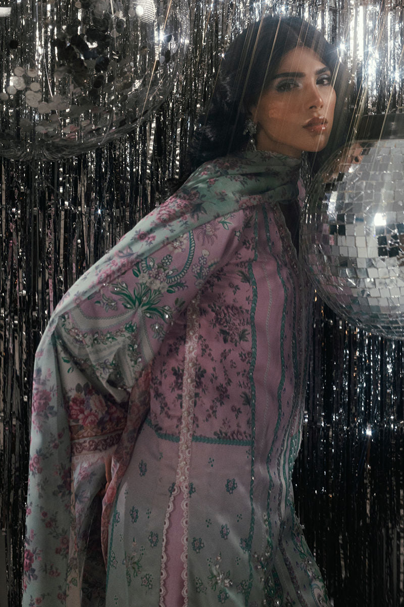 Soft yet striking, Mint Blush Harmony blends two serene shades—mint and light pink—into a delicate composition of elegance. The shirt features intricate handwork and embellishments, paired with a tailored trouser and a digital print dupatta that completes the look with a touch of artistry and refinement.