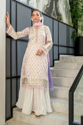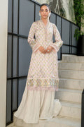 This gorgeous article features a powder pink printed silk A-line three paneled shirt with an embroidered and embellished neckline with raw edges and embroidered scallop details on the daaman and organza and lace details on the sleeves paired with a white cotton silk crushed skirt and a cotton silk dupatta.