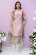 <p>This gorgeous article features a pastel pink digital printed long shirt. The design showcases a fusion of traditional Mughal and Chundri motifs with tropical palm trees, creating a unique and artistic composition. The neckline and front panel are intricately embellished, finished with delicate gota lace detailing. The ensemble is paired with contrasting crushed shirt and a printed dupatta, completing the look with effortless charm and cultural sophistication.