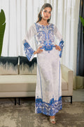 This modern article features a white and blue printed floor length kaftan with long flared sleeves and an embroidered and embellished neckline and sleeves all finished with pearl details.