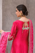 A majestic crimson long kameez paired with churidar trousers and a dupatta, embodying heritage with modern finesse. The ensemble features exquisite resham embroidery, sequins, and zardozi handwork in shades of gold and mint, delicately placed over a jewel-toned canvas. The dupatta carries traditional motifs with a zari border, adding a regal charm. Perfect for formal occasions and festive gatherings, this design reflects royal sophistication..