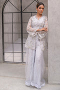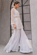 A graceful ivory-white ensemble exuding delicacy and poise. The sheer organza jacket, intricately adorned with pearls, sequins, and silver threadwork, is layered over a tonal inner and wide palazzo pants with subtle shimmer detailing. Light, airy, and radiant, this look is ideal for nikkah ceremonies, receptions, and sophisticated soirées.