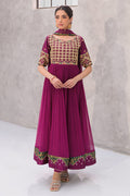 An enchanting plum-toned kalidar with a heavily embellished bodice in resham, zari, and sequins forming geometric floral patterns. The flowing panels are kept minimal with delicate scattered motifs, finished with an Embroidered border in deep green and gold. Paired with a matching dupatta and straight pants, this ensemble strikes the perfect balance of opulence and sophistication—ideal for receptions, formal dinners, and festive soirées..