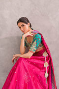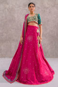 A vibrant magenta lehenga paired with a rich emerald green blouse, intricately hand-embellished with sequins, resham, and zari embroidery. The voluminous lehenga is adorned with delicate scattered motifs and bordered with intricate detailing, while tassel accents complete the regal look. This ensemble radiates festive grandeur—ideal for mehndi nights and celebratory evenings..