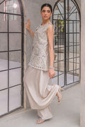 A contemporary ivory-beige ensemble that fuses modern elegance with traditional craftsmanship. The sleeveless jacket is intricately hand embellished with silver sequins, crystals, and threadwork, styled over wide legged silk trousers for a sleek silhouette. Minimal yet regal, this outfit is a versatile choice for evening soirées, engagement parties, or as a refined festive look..