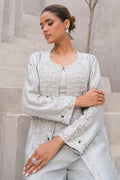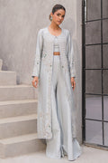 A modern ivory ensemble redefining elegance. The long open jacket is embellished with delicate handwork in silver sequins, cutdana, and thread detailing, layered gracefully over wide palazzo pants and a cropped inner blouse. Sleek, refined, and luxurious—this look is ideal for engagement parties, contemporary weddings, or sophisticated evening events..