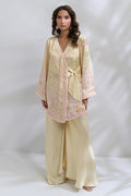 Step into calm luxury and feminine softness with this shamooz silk coord set that features butter-yellow and blush color palette. This is a wrap-style kurta that features wide sleeves and delicate edging and an overall unique cut, paired with flowing palazzo pants in matching butter tones and a similarly printed scarf making it perfect for festive brunches, bridal showers, or an elegant summer evening