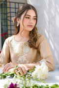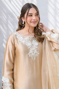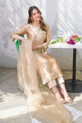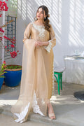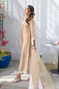This sophisticated article features and beige colored long shirt in pure sheesha silk with an embroidered neckline and borders finished with cutwork and loops and pearls details all finished with cotton silk straight pants and a pure organza dupatta with embroidered cutowork