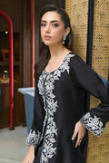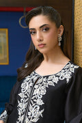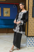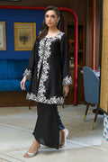 This Black and white article features a sheesha silk front open coat with fully embroidered and embellished neckline, front panels, daaman and sleeves all paired with high-lo silk flared pants and a matching slip.
