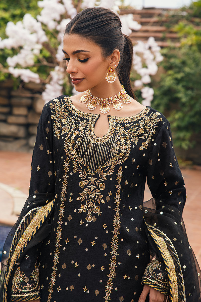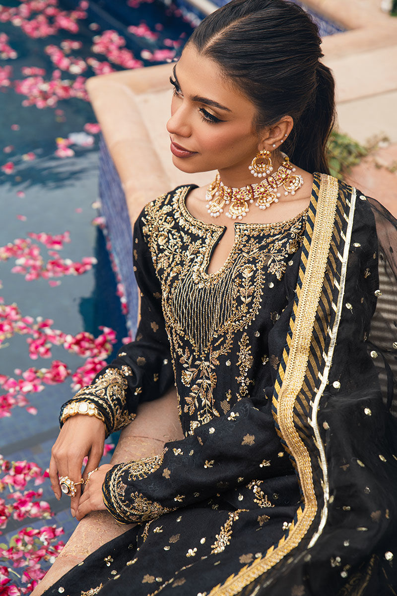 The black Khaadi silk heavily worked kurta sounds like a masterpiece of hand crafted artistry. The delicate embroidery and lace details on the sleeves must add a touch of elegance. Paired with embellished culottes and an organza sequins dupatta, the ensemble likely creates a striking and stylish look.