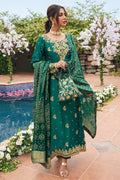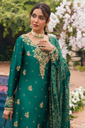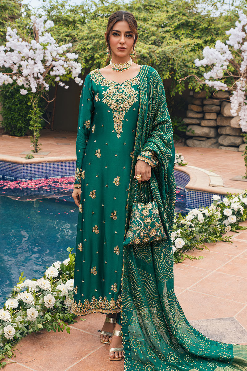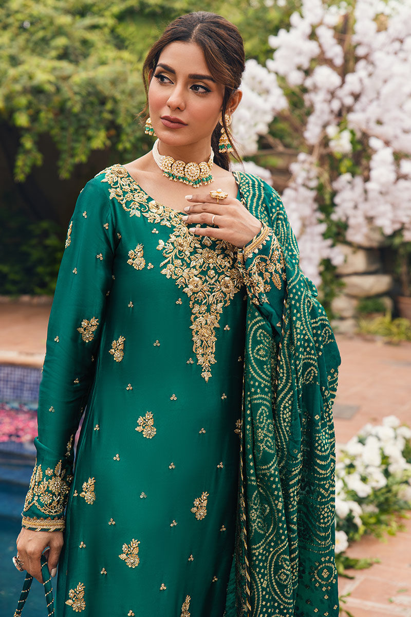 A truly exquisite and detailed outfit, perfect for the festive season! The combination of emerald raw silk, intricate floral motifs, zari embroidery, and handcrafted details sounds stunning. The use of kora dabka on the entire shirt along with the artful zari embroidery on the sleeves, must create a captivating look. The silk pants and dupatta complements the shirt beautifully.