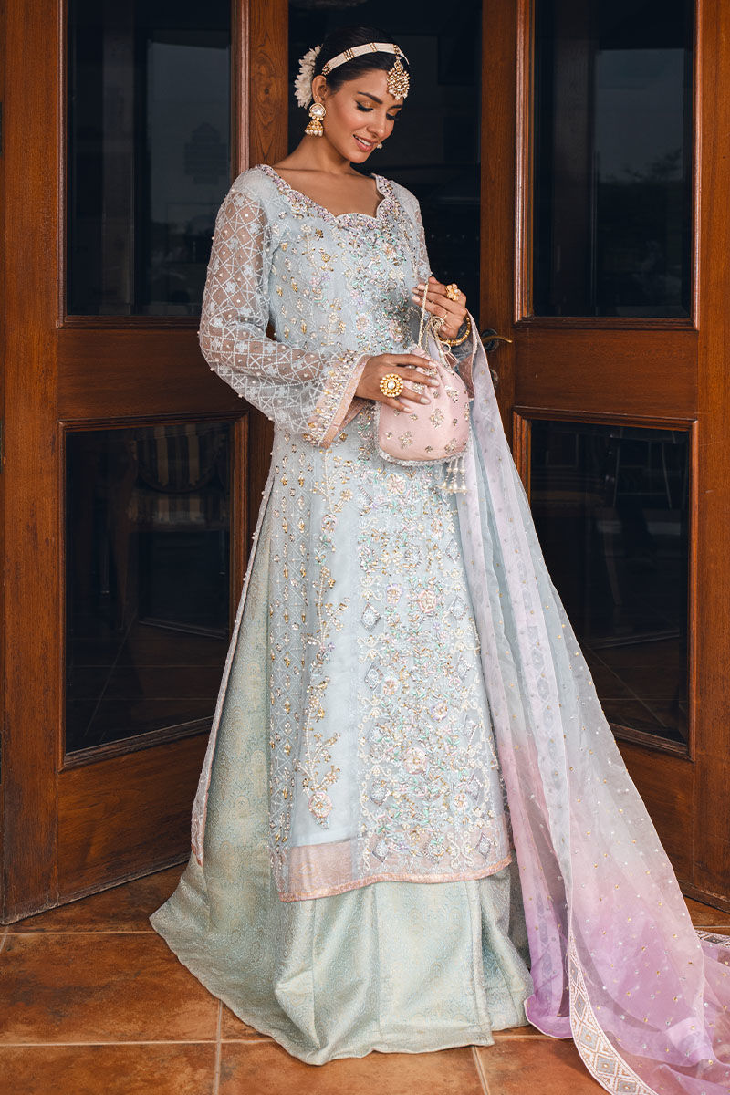 This stunning long silhouette kalidaar is an amalgamation of different patterns of floral embroidered organza. The neckline is handwork to detail with silk thread rosettes enhanced with pearls, sequins and light-catching crystals. The back neckline is further adorned with 3d roses and tassels. Long and bell sleeves with handwork and floral details add a twist. The shirt is paired with jamawar lehnga skirt with 3 colored tones embellished dupatta with block-printed trimmings