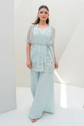 A captivating aqua organza short coat, delicately embroidered and embellished, styled with chic dolman sleeves. Paired seamlessly with fluid silk flared pants and a matching silk inner, this ensemble exudes effortless grace and modern charm.