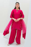 Vibrant and playful, Pinktastic features a hot pink short shirt with threequarter sleeves, adorned with matching organza applique embroidery on the neckline, sleeves, and daaman—elegantly highlighted with silver embellishments. The look is completed with a coordinating pure organza dupatta and a flowing farshi shalwar in the same striking shade.