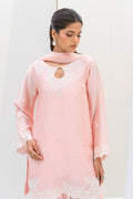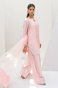 A lively and feminine ensemble, Rosie showcases a millennial pink sheesha silk short shirt adorned with delicate white embroidery on the neckline, daaman, and sleeves—elegantly finished with pearl embellishments. It is paired with a matching pure organza dupatta and a flowing Russian silk farshi shalwar for a graceful and modern look.