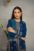 Step into refined elegance with this striking 3-piece royal blue jacket dress, designed to make a bold yet graceful statement. The ensemble features a long embroidered jacket, beautifully detailed with intricate patterns along the front and sleeves embroidery that add a touch of luxury and sophistication.