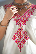 Radiate elegance with this beautifully crafted 3-piece white sheesha silk outfit, designed for refined festive wear. The embroidered shirt features intricate sheesha (mirror) work that adds a soft sparkle and traditional charm to the luxurious sheesha silk fabric. Delicate threadwork further enhances the graceful design, making it both timeless and eye-catching.