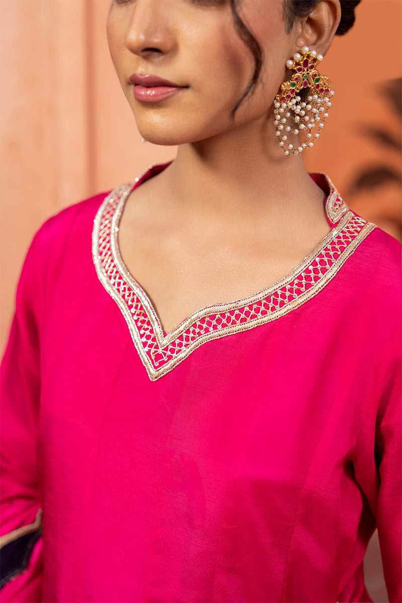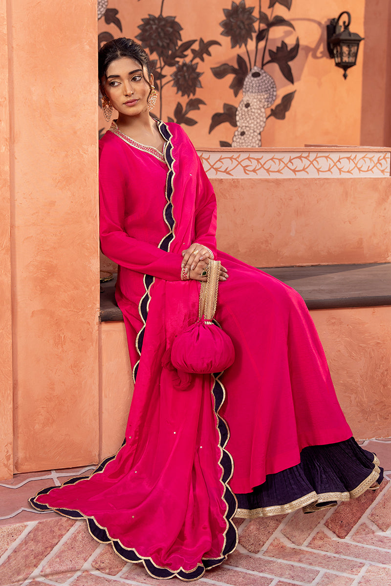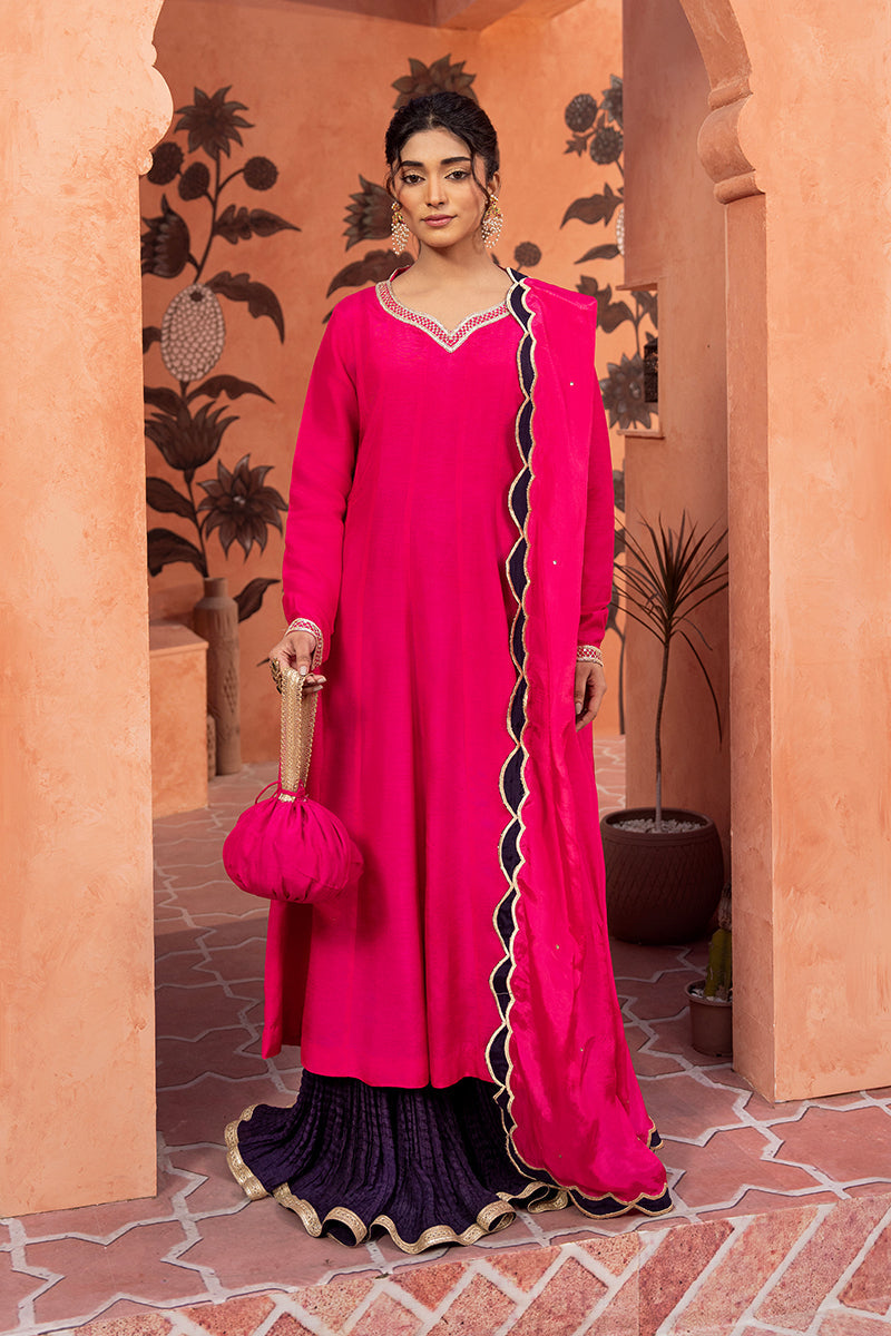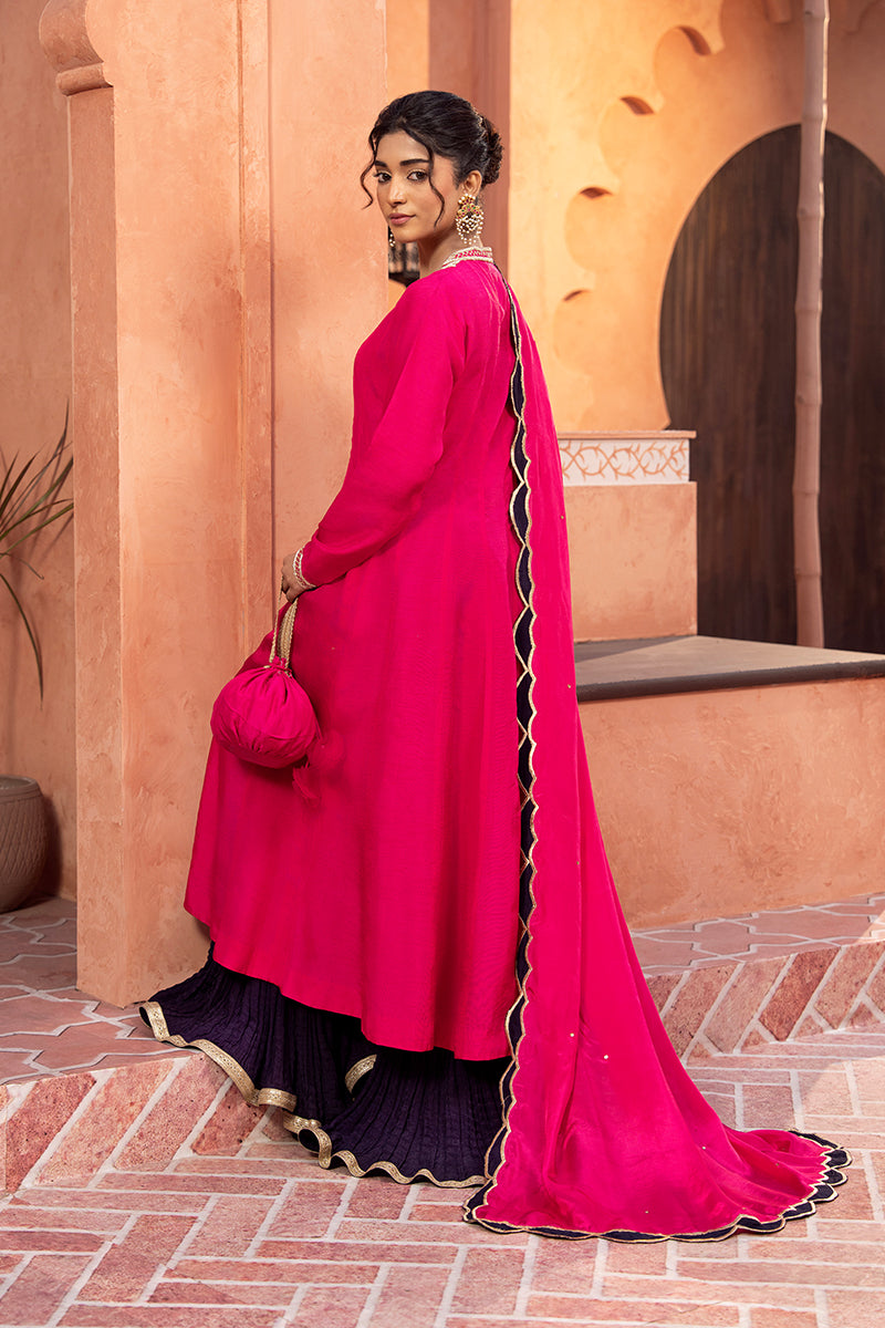 Pink silk Pishwas paired with a rich purple Sharar.