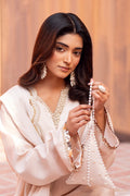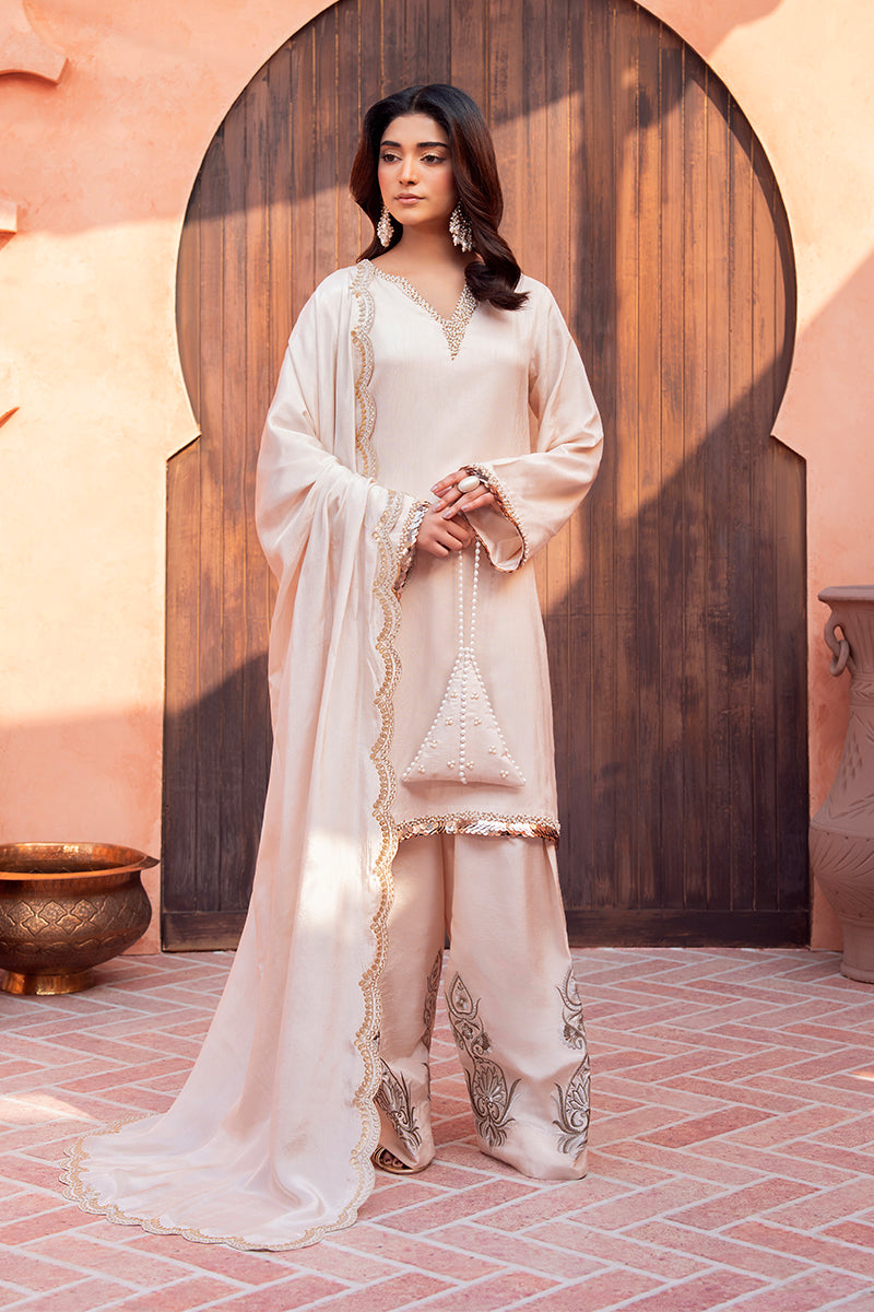 Refined beige silk short shirt and shalwar ensemble.