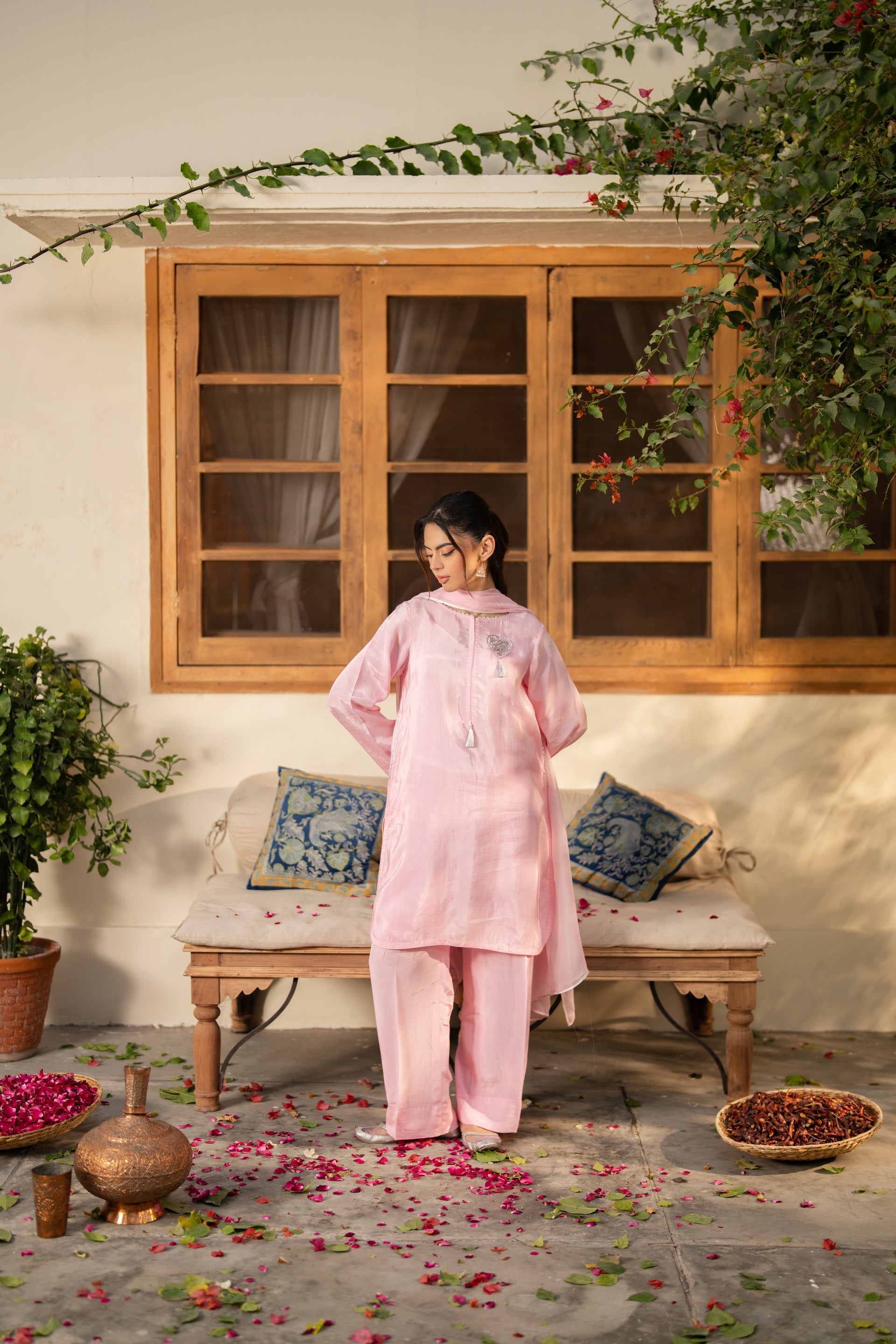cute pink raw silk outfit, featuring traditional adda and zari embroidery. A heart-shaped motif embellishment adds a playful yet elegant accent, making it perfect for festive or casual ethnic occasions.Complete the look with the optional chiffon dupatta for a soft, flowing finish. Comfortable, stylish, and timeless, this outfit is ideal for those who love a mix of classic ethnic charm and modern cuteness