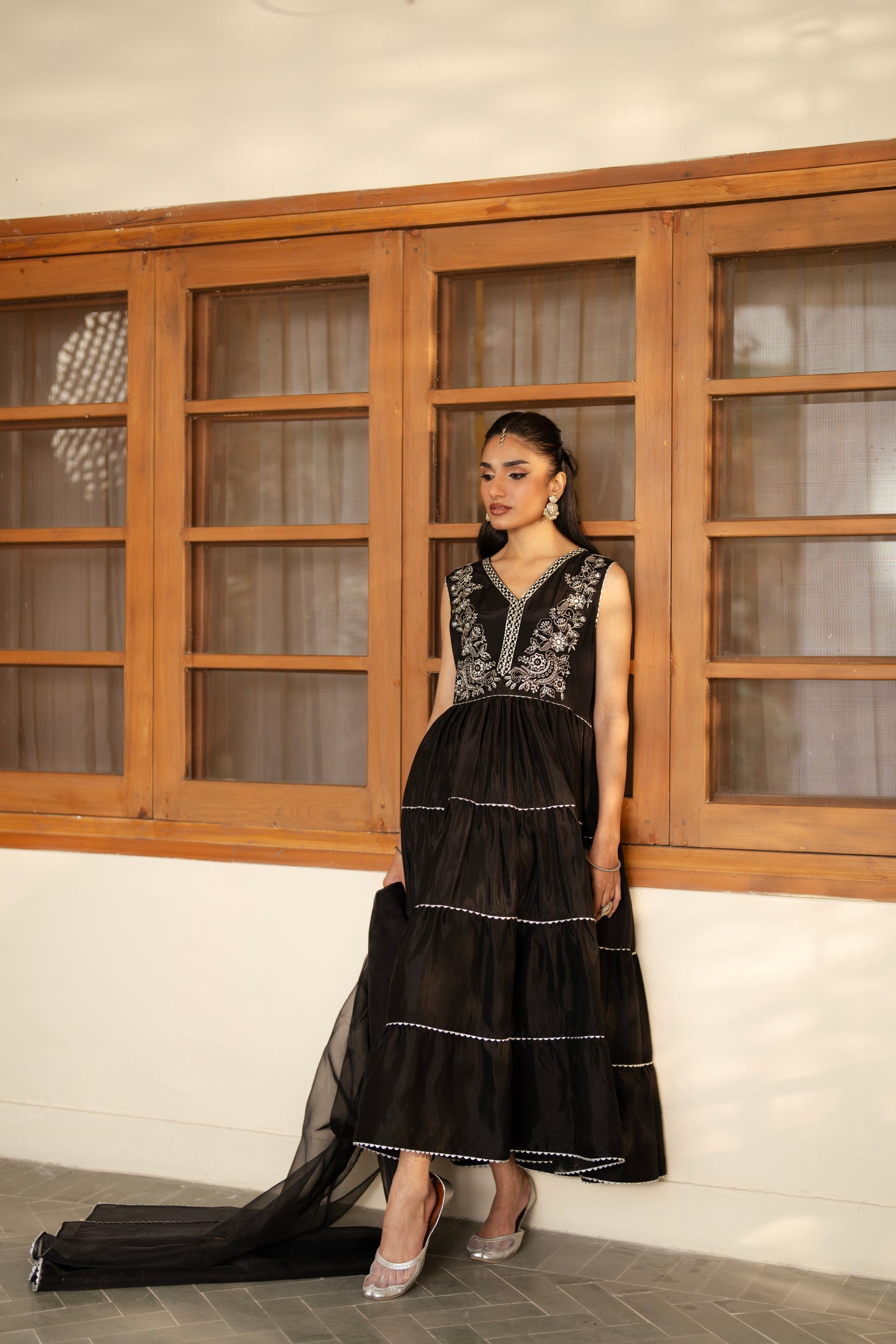 Keep your everyday style effortlessly elegant with this black 3-layered dress crafted from premium raw silk. Designed for comfort and simplicity, the dress features subtle neck embroidery enhanced with gota details, adding just the right touch of charm without overpowering the look.The outfit comes with a matching black trouser, making it an easy, ready-to-wear choice for casual outings, workdays, or basic semi-formal gatherings
