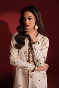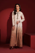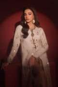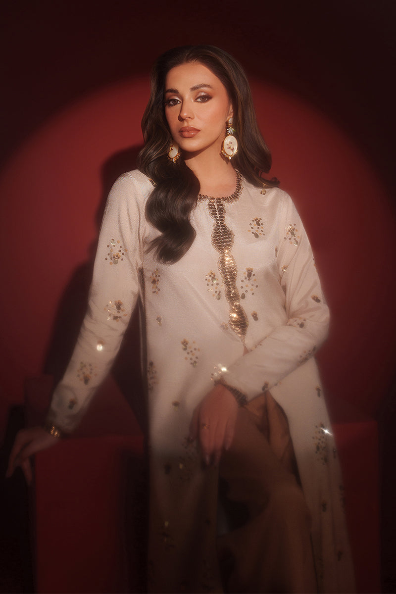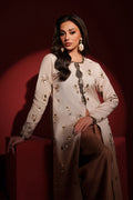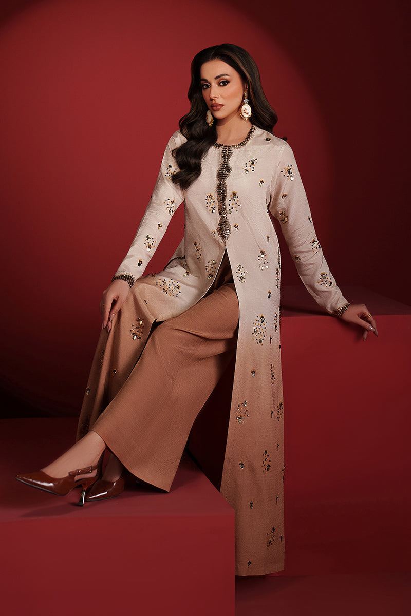 This gown-inspired long dress features sleek side slits and a bold elongated front cut, accented with mixed-material sitara embellishments for a rich, artistic sparkle. Its mocha-coffee gradient shifts from soft mocha to deep coffee, adding depth and couture refinement. Paired with straight trousers, the ensemble blends regal elegance with modern design for a striking, contemporary look. 2Pc