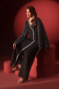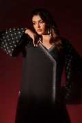 This black raw-silk outfit features a modern angrakha-inspired cutline that blends clean structure with traditional charm. The angrakha panel and sleeves are fully embellished with intricate adda embroidery, adding rich texture and a couture finish. With fused detailing for a crisp shape and sleek straight trousers, the ensemble delivers bold, contemporary sophistication-ideal for fashion-forward occasions. 2Pc