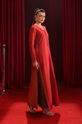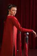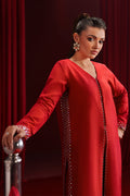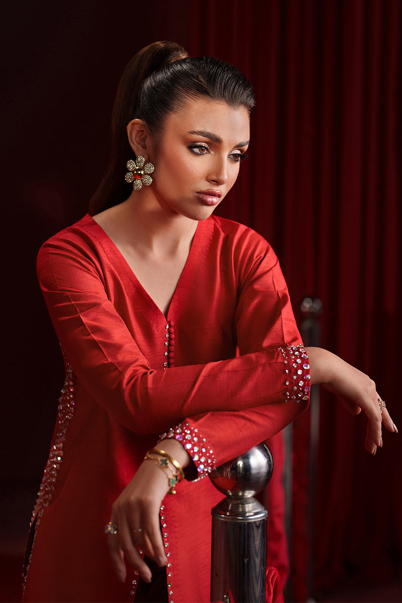 This rich red raw-silk dress features a contemporary shirt cutline with a refined front center cut, accented by delicate adda embroidery. Matching adda work along the side slits adds handcrafted elegance. The fused structure offers a crisp, polished look, while straight trousers complete the sleek silhouette. Perfect for formal occasions, it blends modern style with traditional detailing. 2Pc