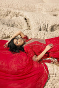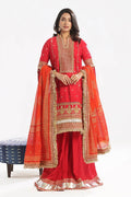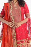 Zari, Sequins & Cord Embroidered Lacquer Printed Raw Silk Shirt Front & Sleeves with Lacquer Printed Raw Silk Back. Zari, Sequins & Cord Embroidered Lawn Neckline, Borders for Front, Back & Trouser. Gold Printed Lawn Borders for Front, Back & Sleeves - 3.2 Meters